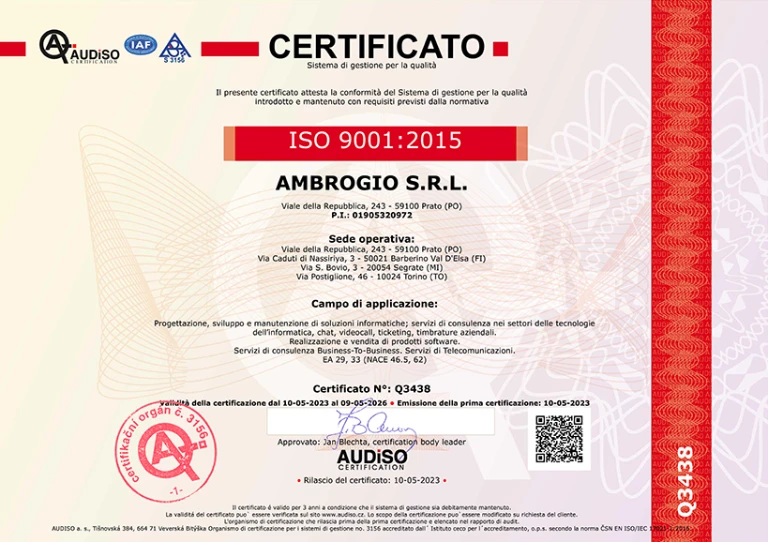 L’obiettivo principale dell’azienda è superare le aspettative dei clienti, e la certificazione ISO 9001 dimostra l’impegno nel seguire gli standard di gestione della qualità più elevati, offrendo servizi di prima classe e un processo di innovazione continua.